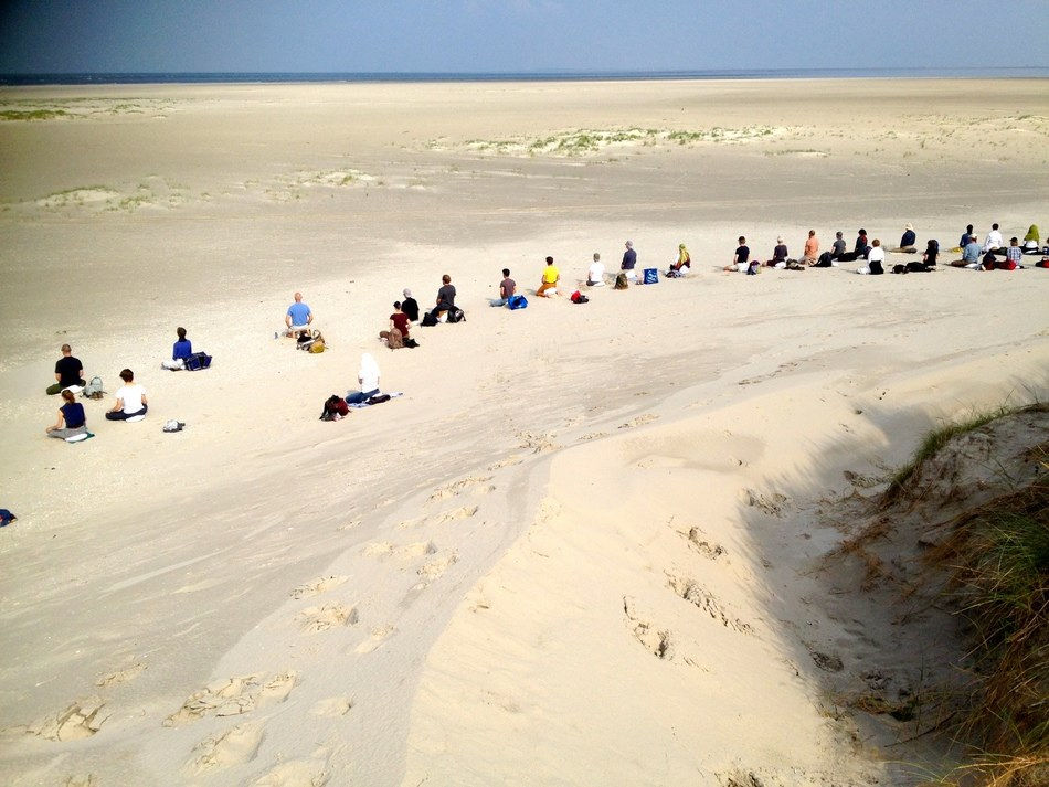 Tijdens de 20 minuten durende wandeling (in stilte) van de boot naar onze meditatieplek bij de eerste duinen was ik al zo geraakt en overdonderd door de ruimte, het licht, de kleuren en de stilte (alhoewel er heel wat geluiden te horen zijn van de zee, de wind en de vogels heb ik daar toch vooral stilte ervaren). En ik werd overspoeld door religieuze gevoelens, diepe verbondenheid, grote dankbaarheid en intense blijheid. God (bij gebrek aan een beter woord) voelde zó dichtbij, onontkoombaar.