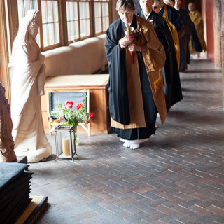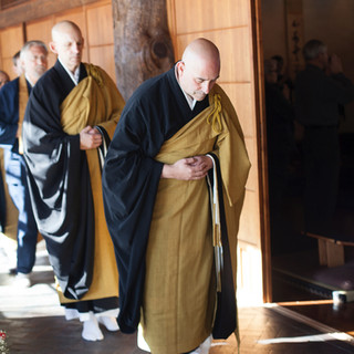There was a big build up [NL: aanloop] before the ceremony. Joshin and Genzan had been preparing [NL: voorbereiden] for months. The 7 days before the ceremony Joshin, Genzan and a small group of others, including myself did jundo three times a day. Jundo is a ceremonial procession where 7 altars all over Upaya were visited, chanting the whole time.