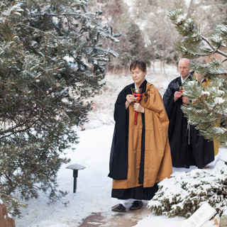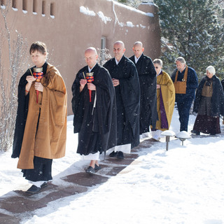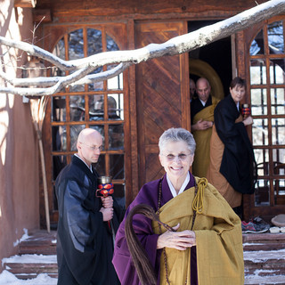 On the day of the final ceremony many pictures were taken. Everybody was wearing their most fancy [NL: chique] zen outfits, the weather was beautiful and there was fresh snow from the night before. And since one of the Upaya residents [NL: bewoners] is a gifted [NL: begaafde] photographer, I have a set of gorgeous photos to share of Upaya at its fanciest [NL: Upaya op z'n sjiekst] .